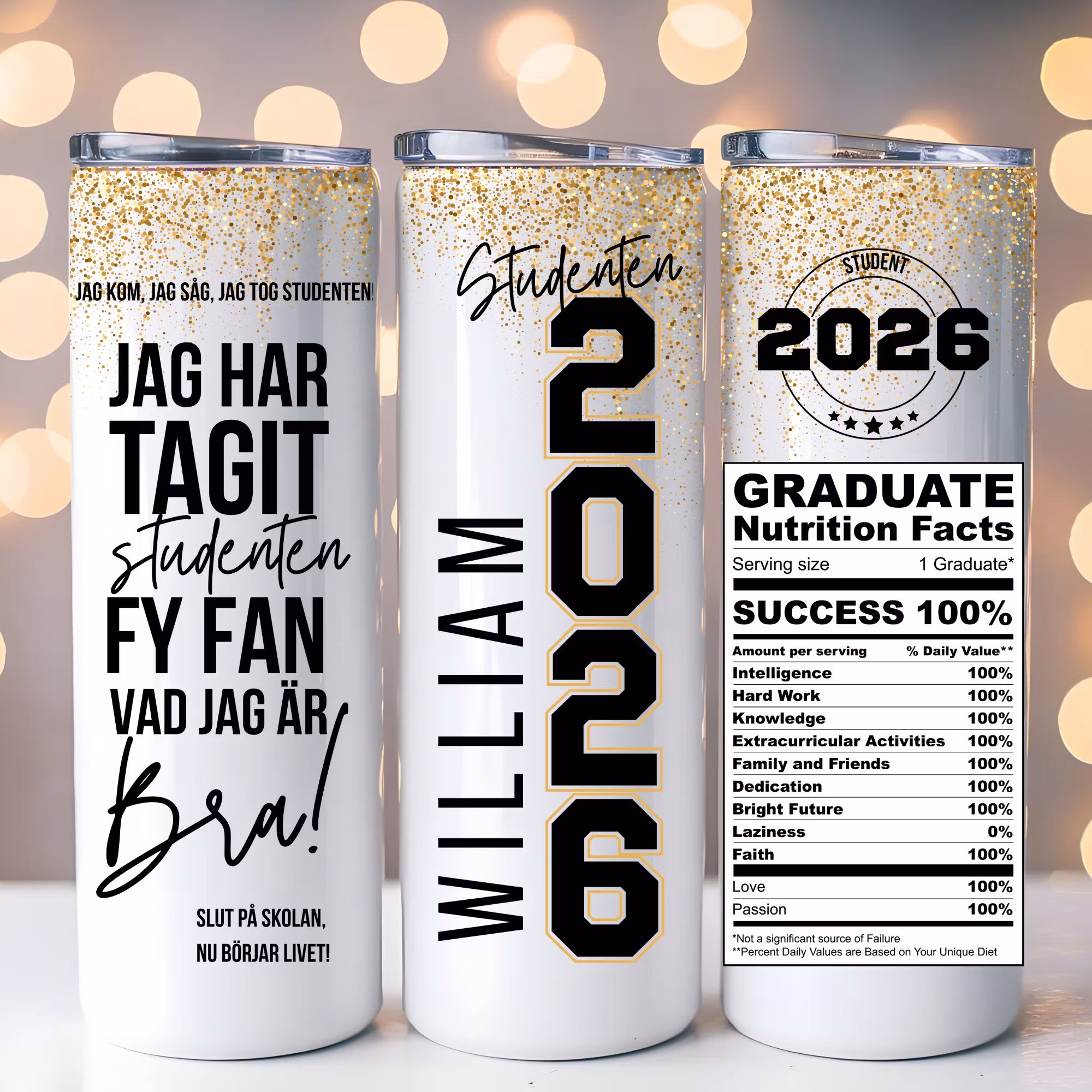 Fira årets största prestation med stil! Den här personliga studentflaskan är lika extra som studenten själv med guldglitter, kaxiga quotes och en design som skriker “Jag är klar med plugget, nu börjar livet!”